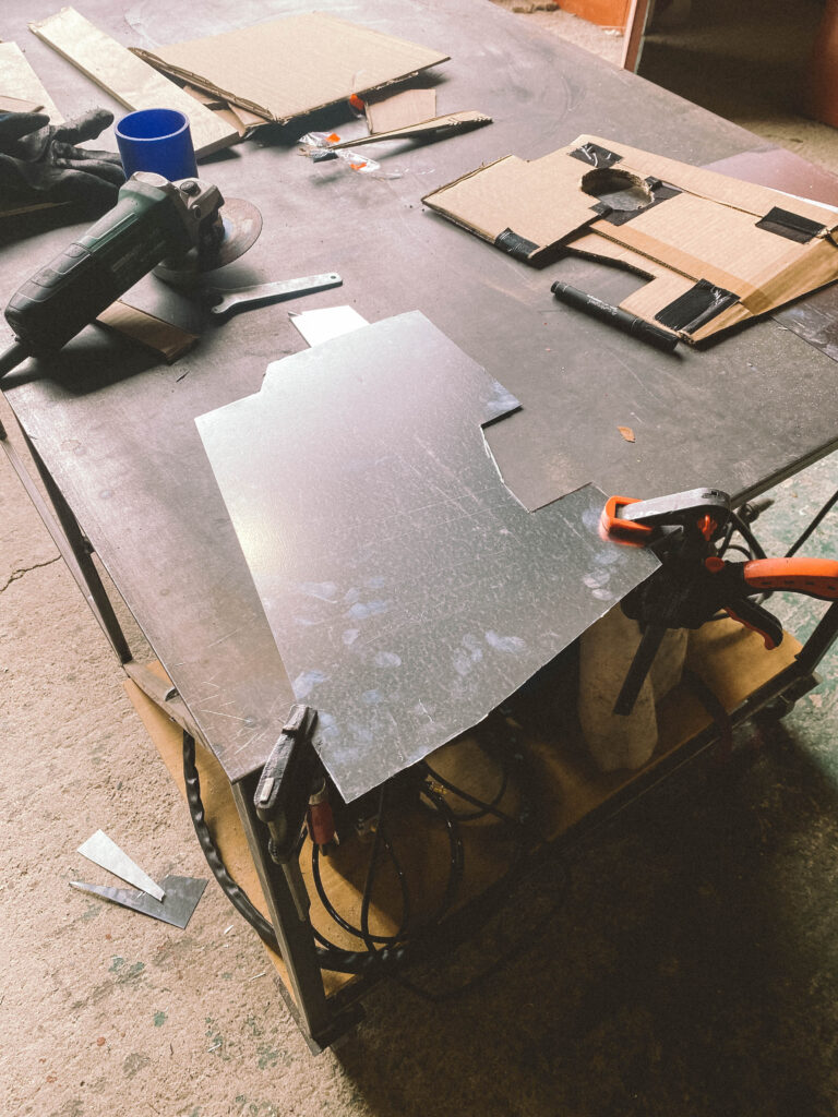 Pěkně si udělat kafe, vzít krabici od kartonu a měřit odstínění. Zkoušet, stříhat, nalepovat. Takhle pár hodin, pak vymyslet uchycení, aby to šlo pěkně sundavat a dávalo to smysl. Překleslit na plech, vzít flexu a vyřezat. Po napasování jsem na plech navařil jednu matku, aby se dobře přichytila dole plus je plech na horní straně přichycený vepředu a vzadu.