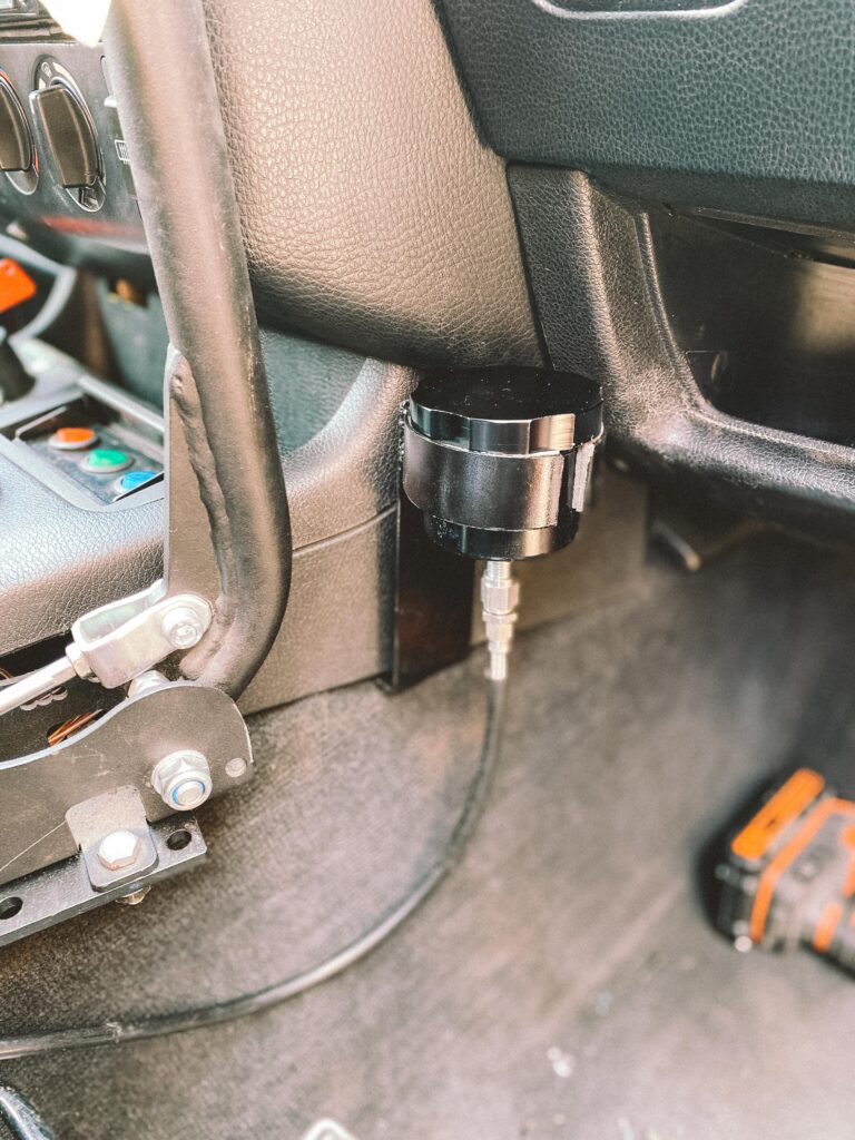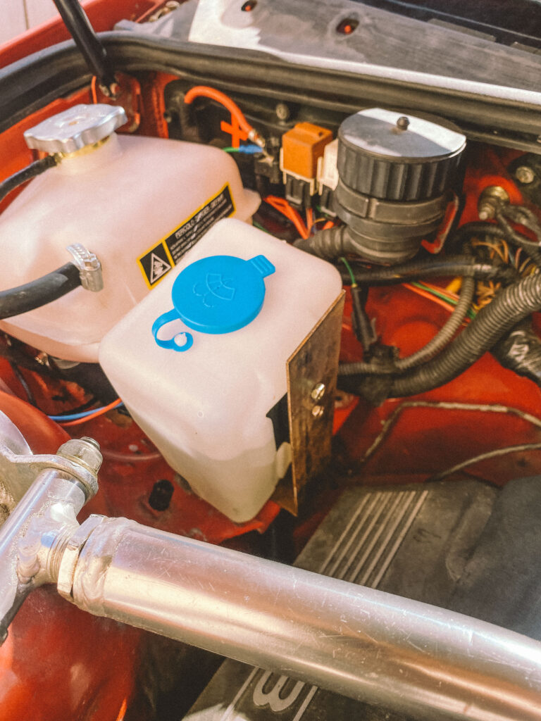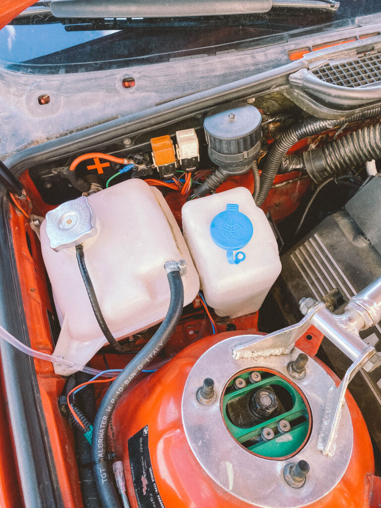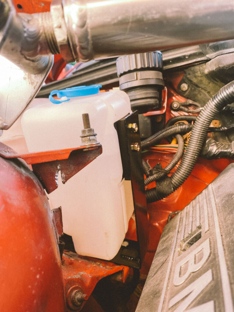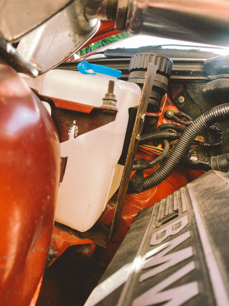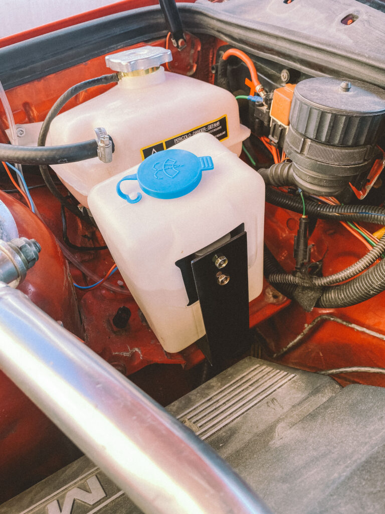 Druhou věcí byl držák na expanzní nádobu na ostřikovače. Kluci z ALL4DRIFT našli ideální malou, hranatou a nainstalovali mi ji tam. Já si chtěl udělat akorát pevnější držák a také ji mít nějak symetricky umístěnou.