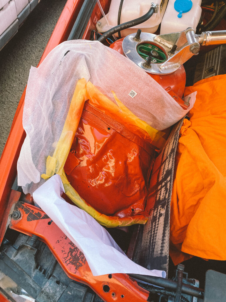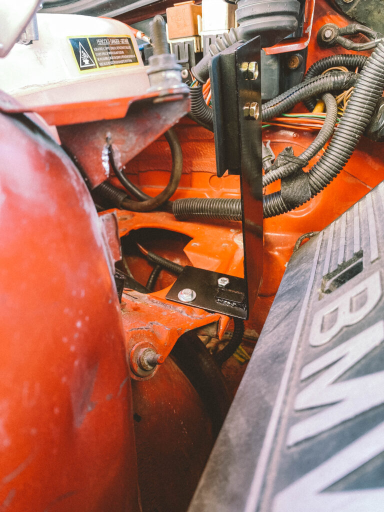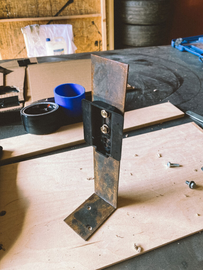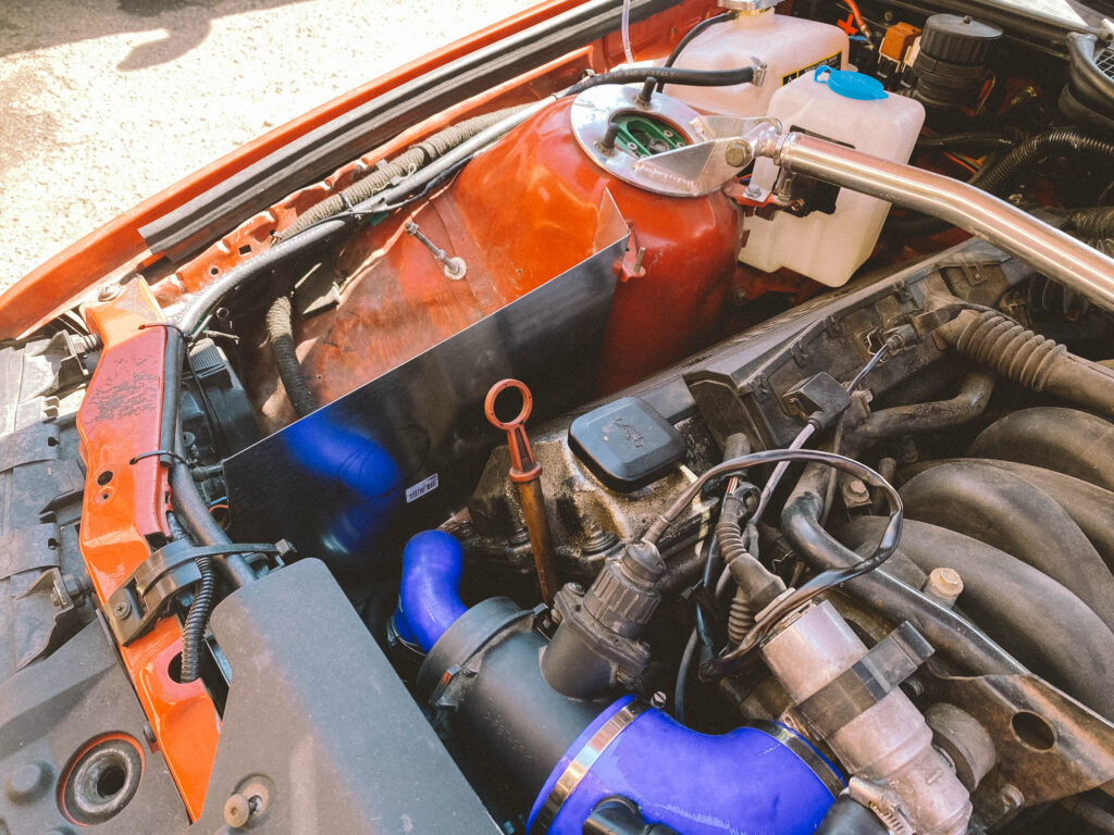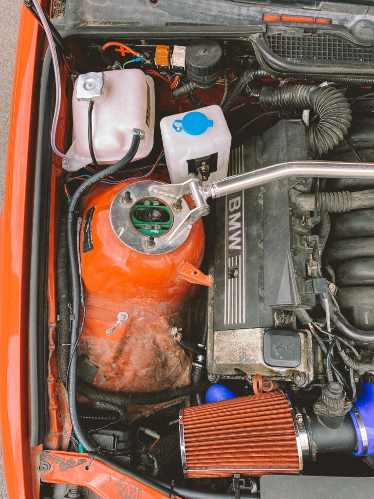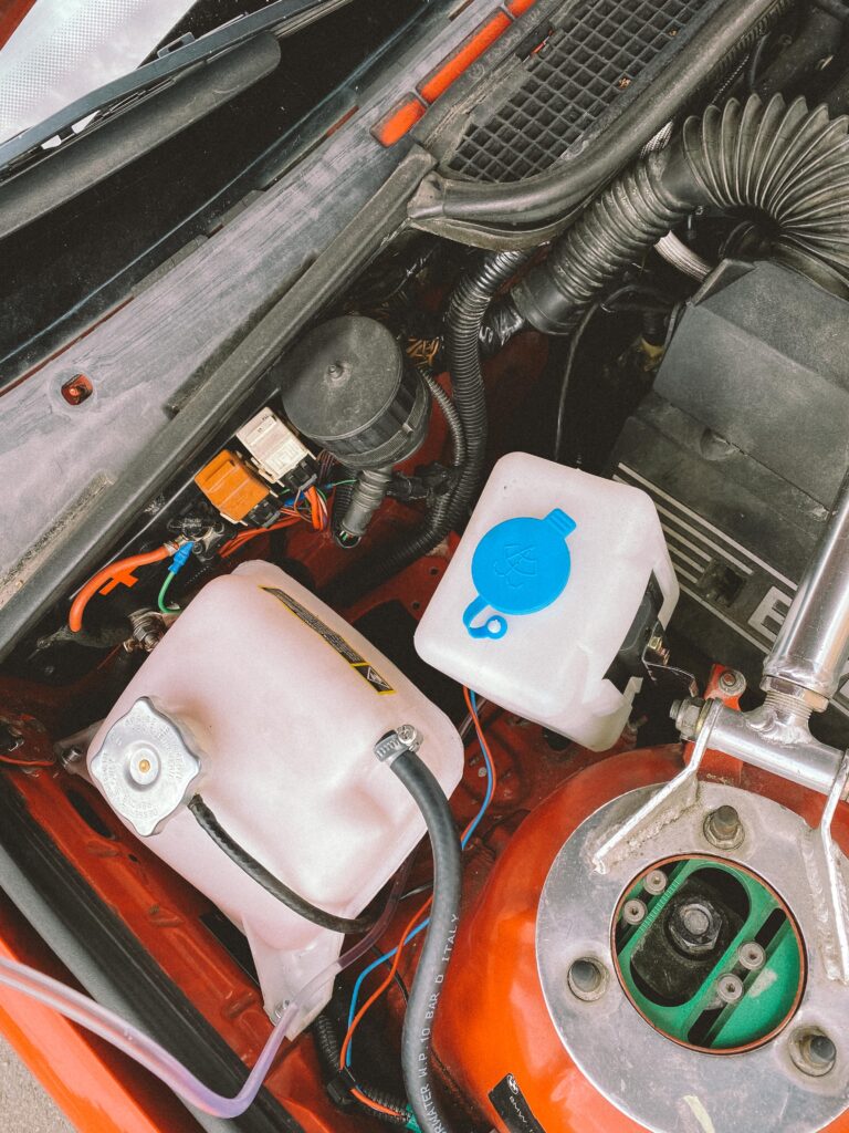 Druhou věcí byl držák na expanzní nádobu na ostřikovače. Kluci z ALL4DRIFT našli ideální malou, hranatou a nainstalovali mi ji tam. Já si chtěl udělat akorát pevnější držák a také ji mít nějak symetricky umístěnou.