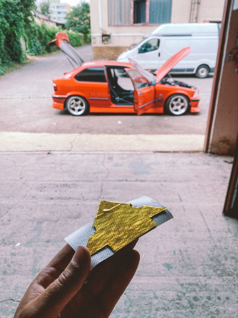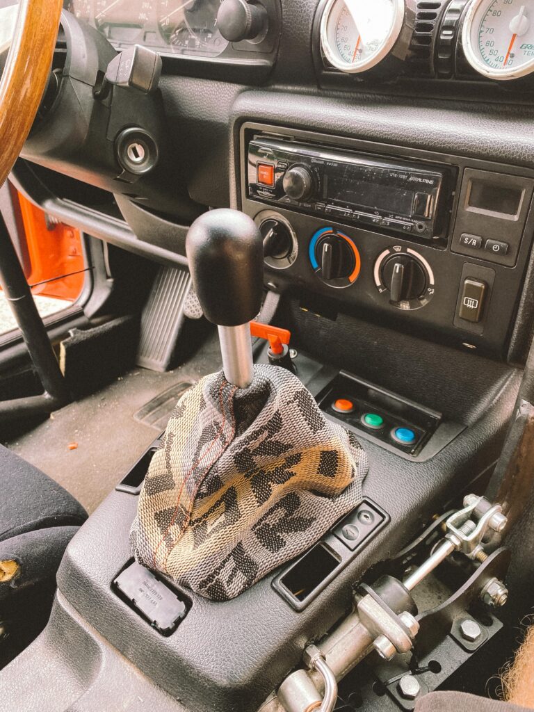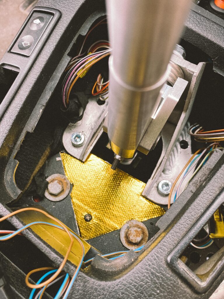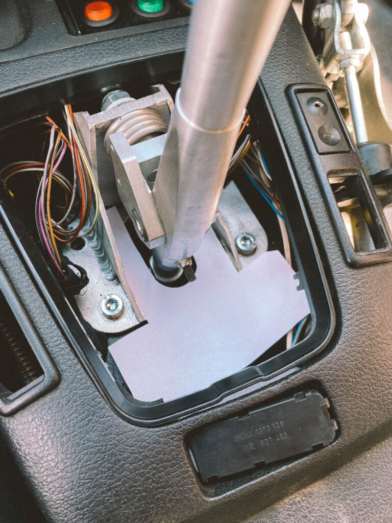 Do auta mi přes shifter pronikalo hodně tepla. Pokusil jsem se to „zakrýt“ celé, ale nakonec se mi podařilo dát jen část dolů, aby to nebránilo chodu řazení. I tento malý kus však hodně pomáhá. Použil jsem také starý kryt fake bride, který jsem měl roky v dílně. Výsledek je skvělý. Už mi neshoří ruka, když v tom jezdím při 40 stupních v Praze a vypadá to celkem „sériově“.