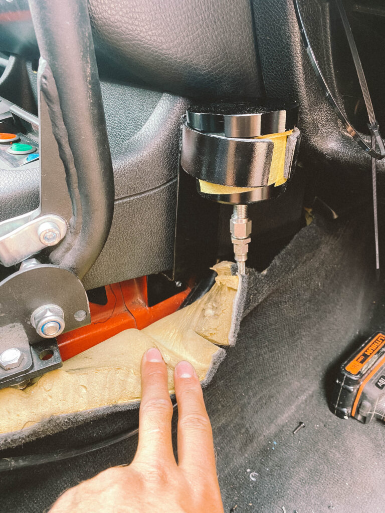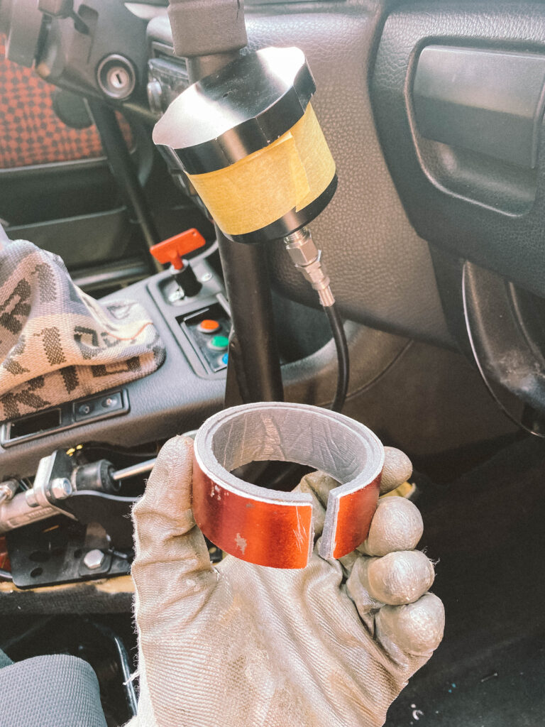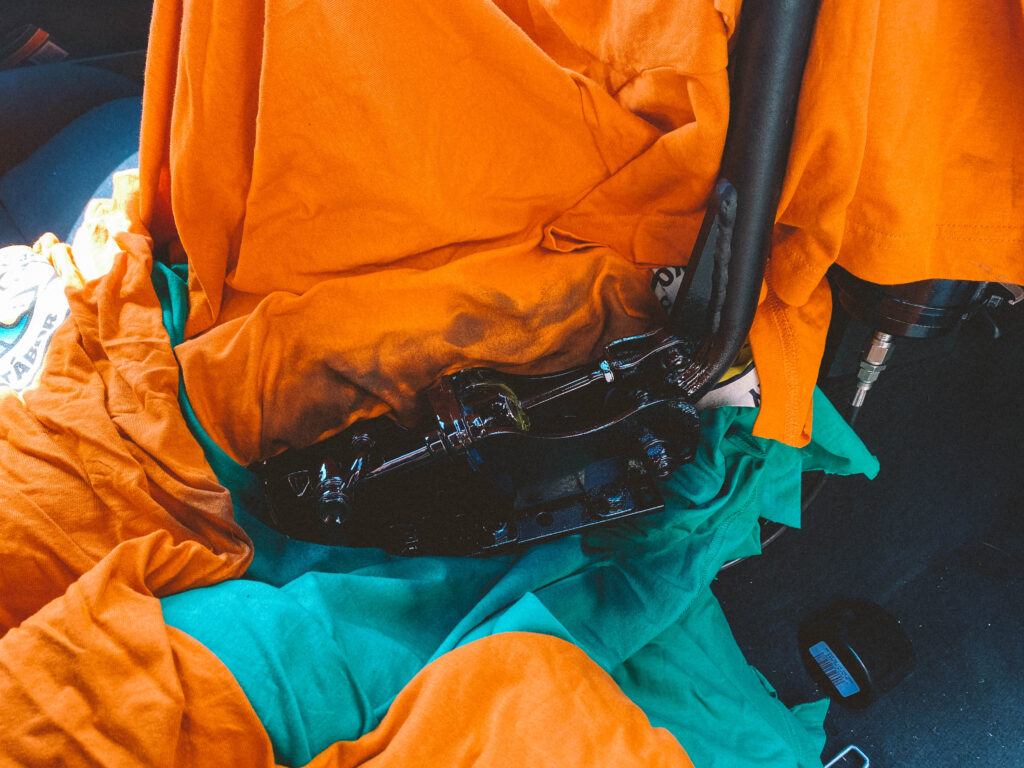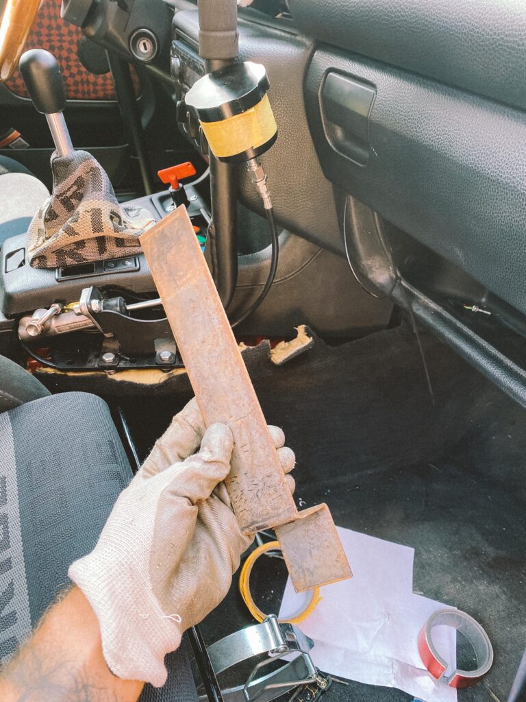 Do auta mi přes shifter pronikalo hodně tepla. Pokusil jsem se to „zakrýt“ celé, ale nakonec se mi podařilo dát jen část dolů, aby to nebránilo chodu řazení. I tento malý kus však hodně pomáhá. Použil jsem také starý kryt fake bride, který jsem měl roky v dílně. Výsledek je skvělý. Už mi neshoří ruka, když v tom jezdím při 40 stupních v Praze a vypadá to celkem „sériově“.