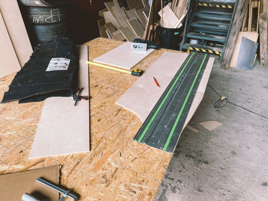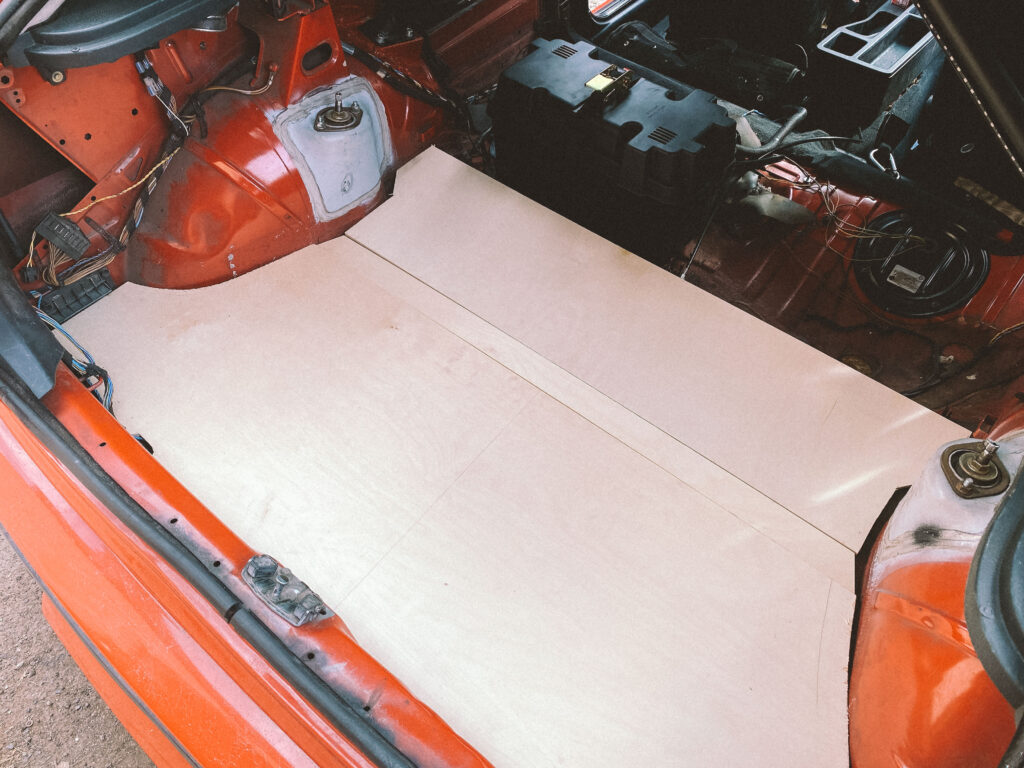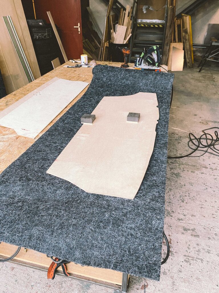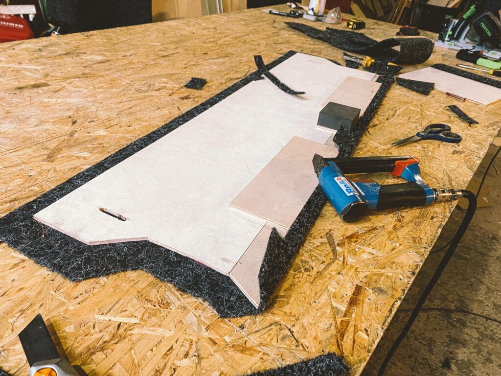 Začal jsem s měřením na kusu kartonu. Překližku na podlahu jsem hledal jen ve zbytcích ve skladu, použil jsem 1cm tloušťku. Proto je z tří dílů. Dva umožňují snadnou montáž a demontáž.