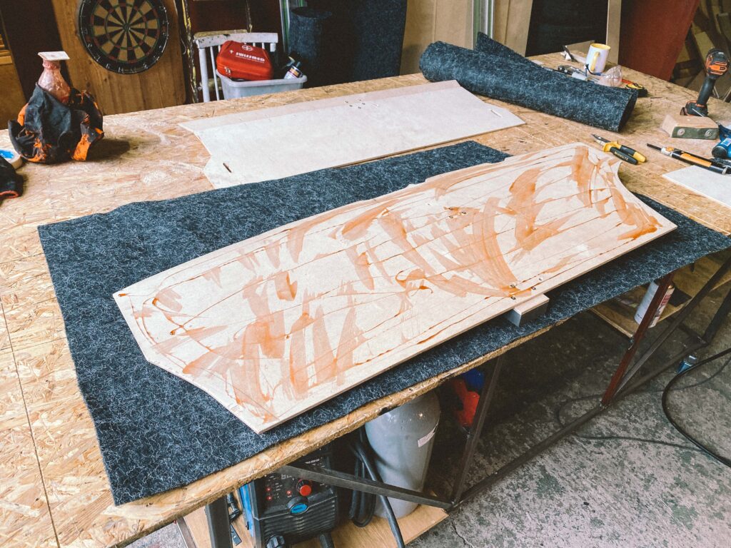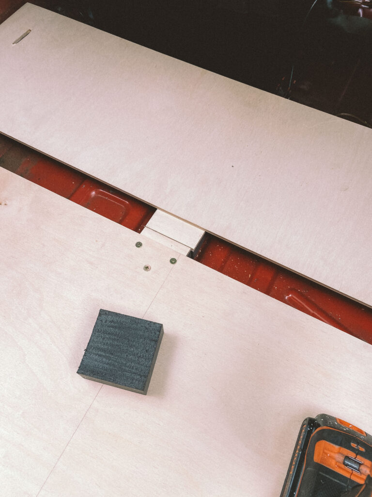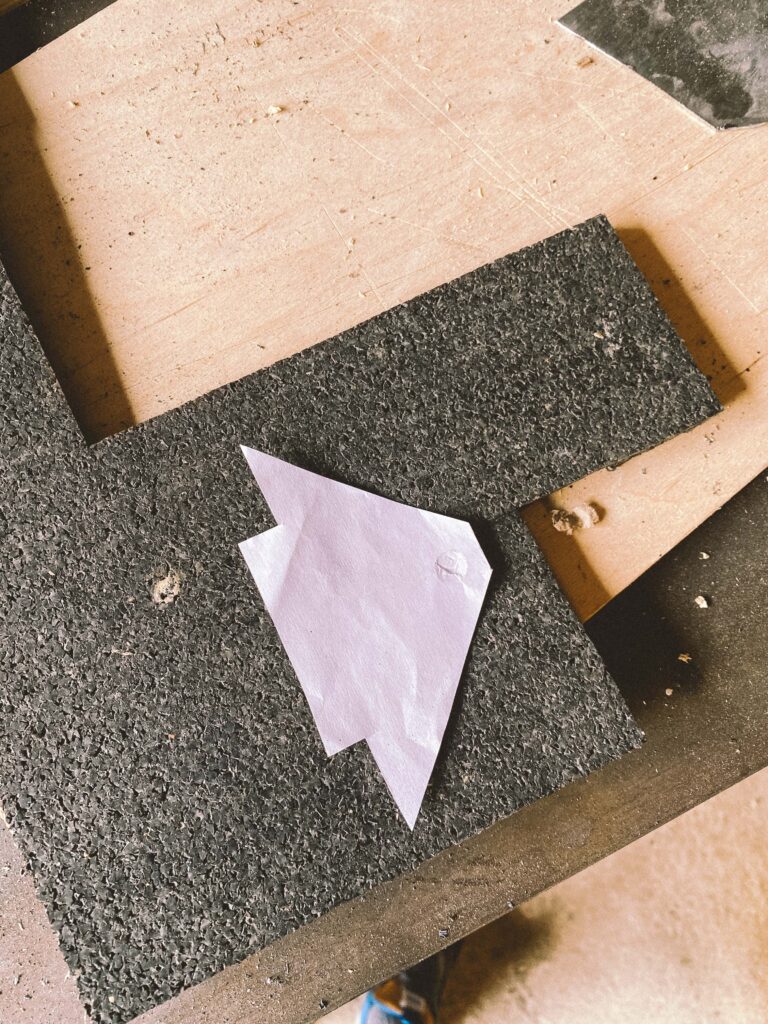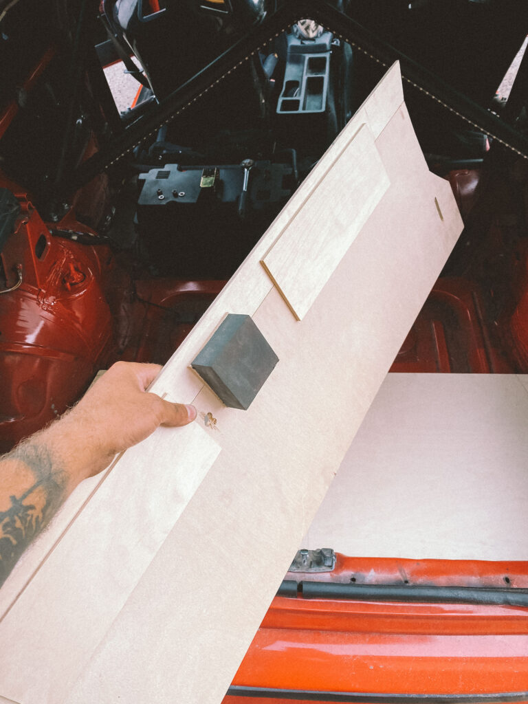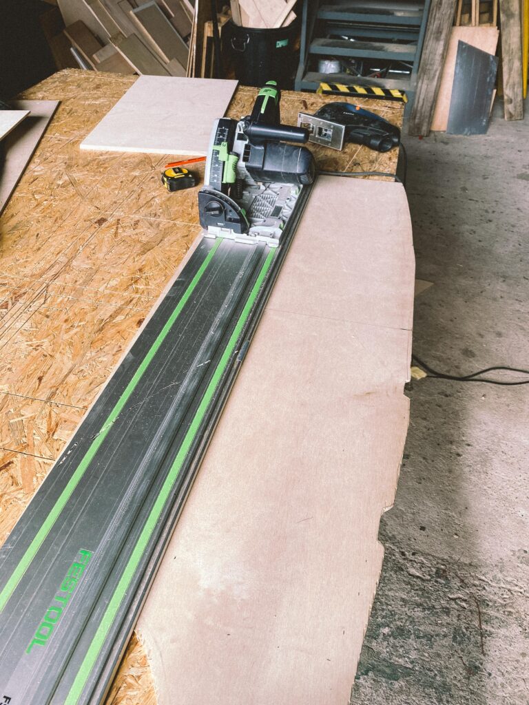 Začal jsem s měřením na kusu kartonu. Překližku na podlahu jsem hledal jen ve zbytcích ve skladu, použil jsem 1cm tloušťku. Proto je z tří dílů. Dva umožňují snadnou montáž a demontáž.