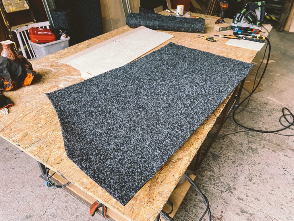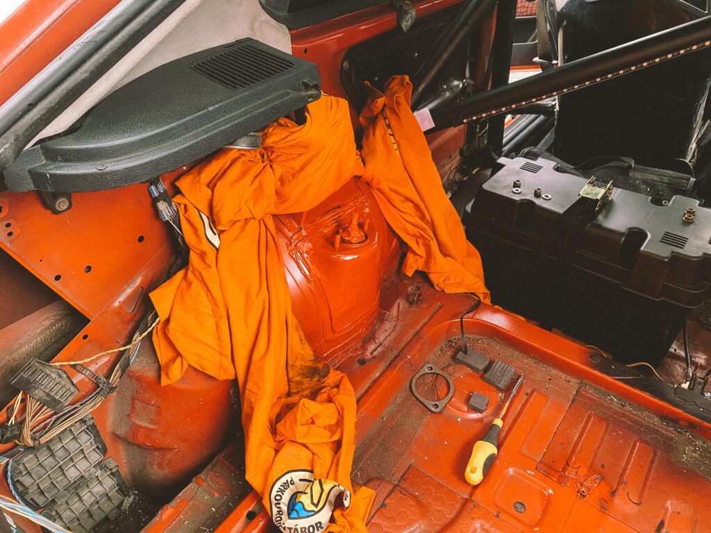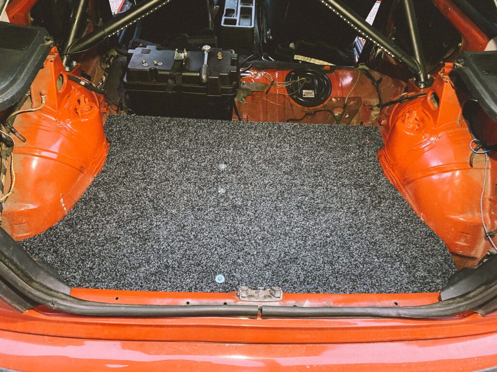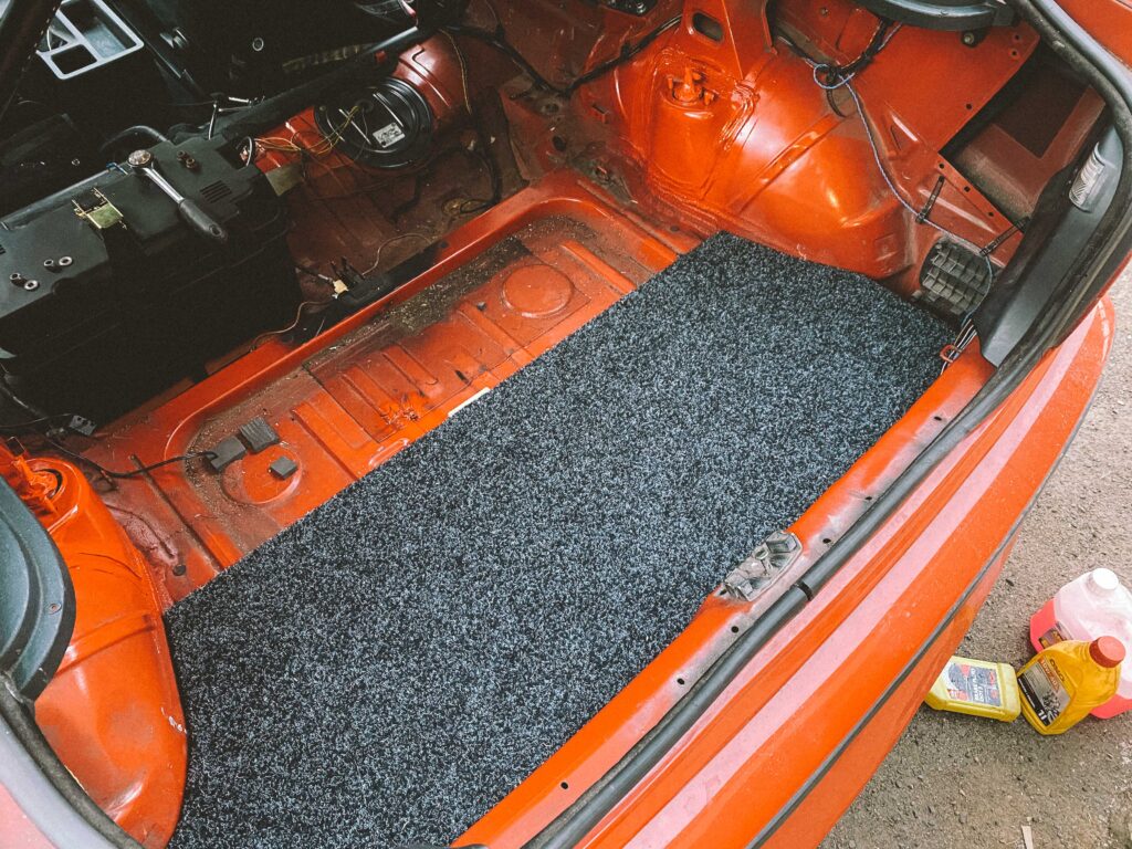 Podlahu jsem vyplnil molitanem, který slouží jako základ odrazový podlahy pro gymnasty. Do podlahy auta jsem navařil tři matky. Do nich se to uprostřed přišroubuje a podlaha se tak přitáhne. Drží pevně a neskáče. Máme v dílně průmyslový koberec a spousty zbytků. Měřil jsem, vystřihl a použil dva kusy. Kamarád mi poradil jak postupovat pak s čalouněním. Lepení, ohyb a nastavení malého tlaku na kompresoru abych nešel skrz. Pak jsem to zezadu vystřílel bouchačkou. Bylo to poprvé, takže mi to chvíli trvalo. Ale dost mě to bavilo.
