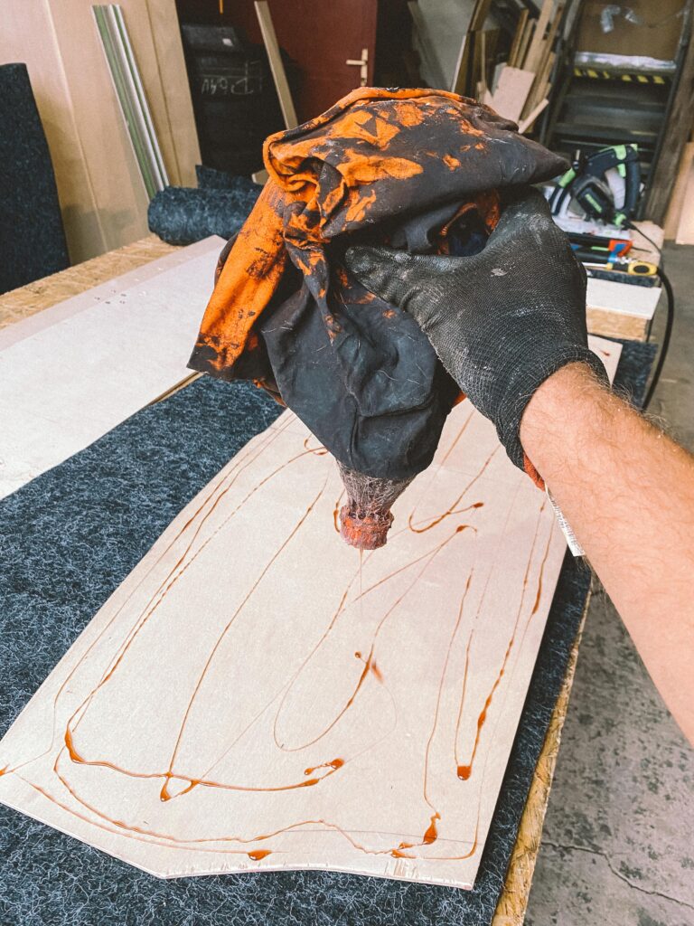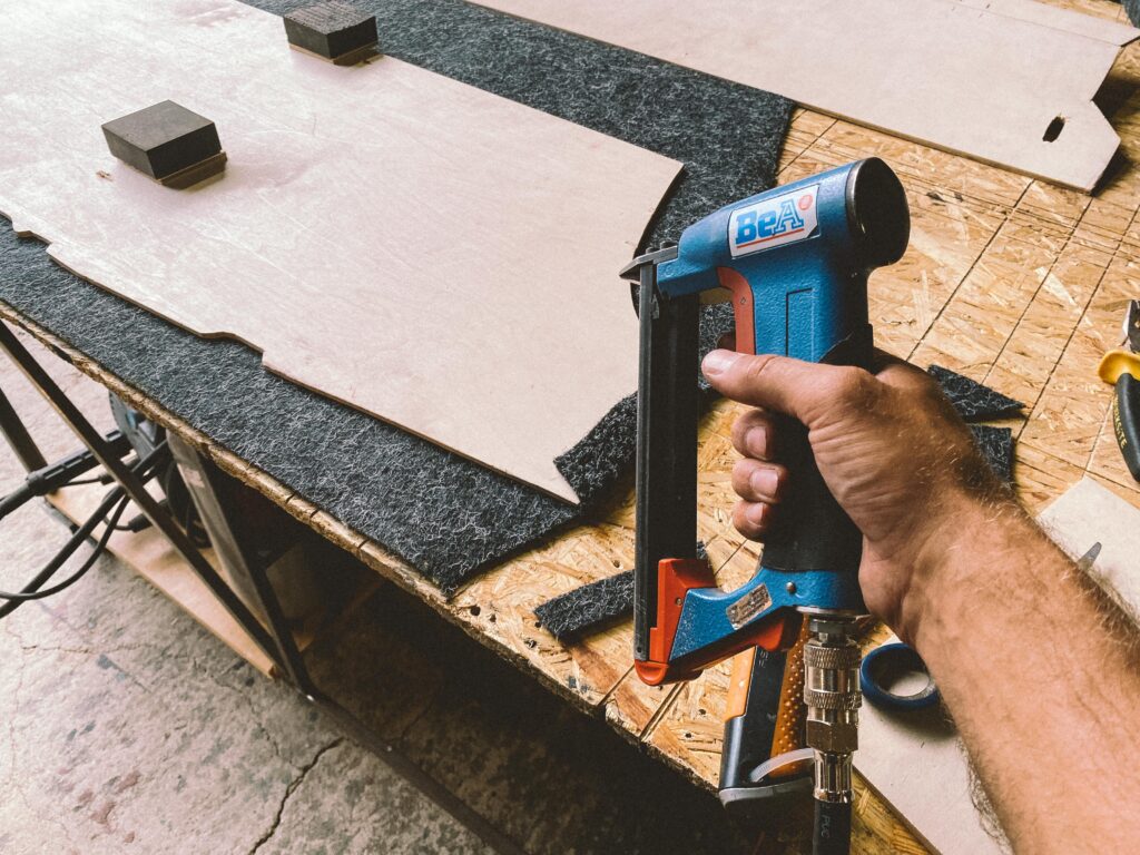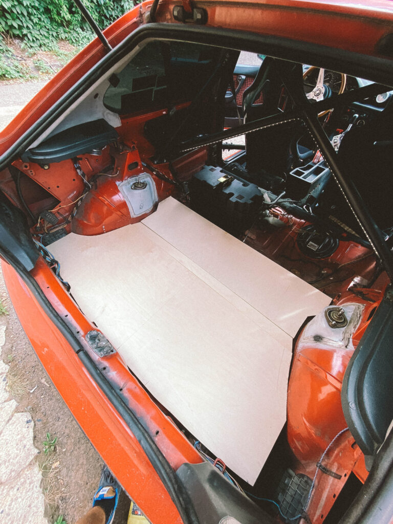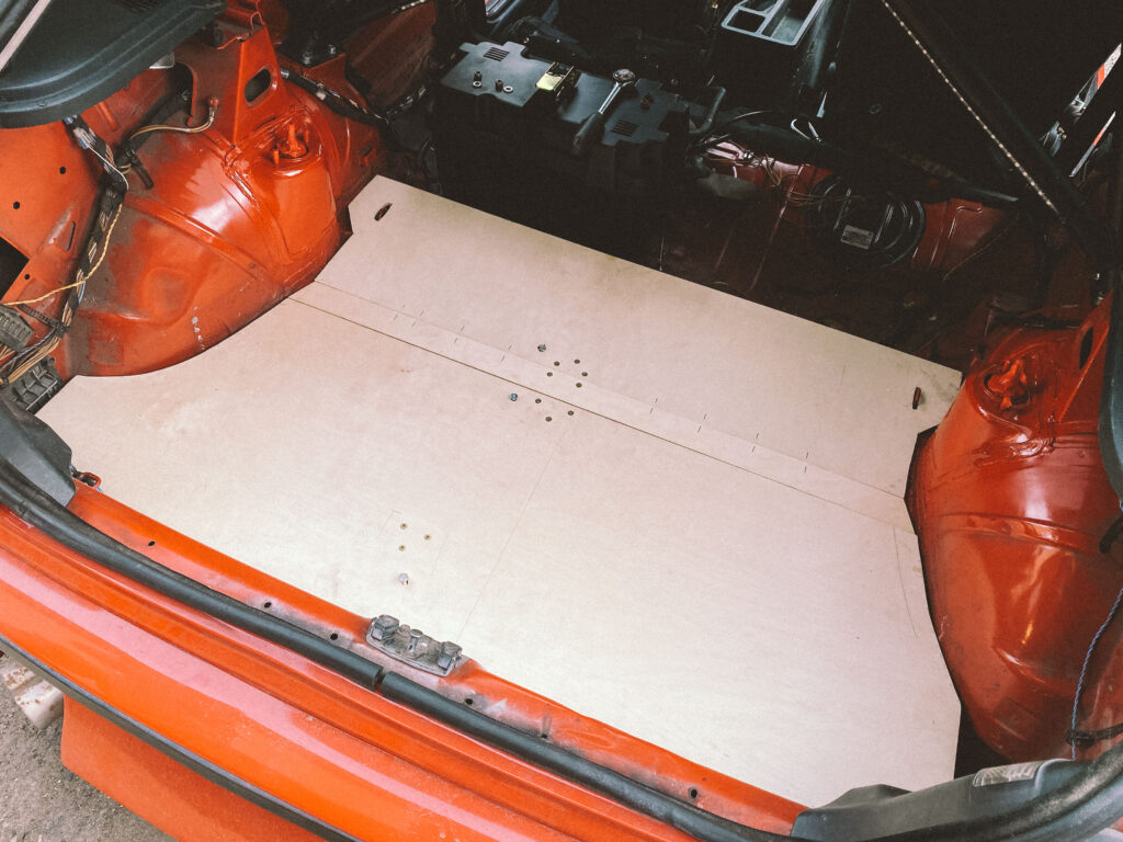 Podlahu jsem vyplnil molitanem, který slouží jako základ odrazový podlahy pro gymnasty. Do podlahy auta jsem navařil tři matky. Do nich se to uprostřed přišroubuje a podlaha se tak přitáhne. Drží pevně a neskáče. Máme v dílně průmyslový koberec a spousty zbytků. Měřil jsem, vystřihl a použil dva kusy. Kamarád mi poradil jak postupovat pak s čalouněním. Lepení, ohyb a nastavení malého tlaku na kompresoru abych nešel skrz. Pak jsem to zezadu vystřílel bouchačkou. Bylo to poprvé, takže mi to chvíli trvalo. Ale dost mě to bavilo.